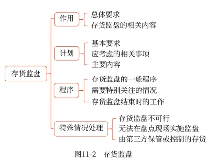 存貨監(jiān)盤的內(nèi)容包括存貨監(jiān)盤的作用、計劃、程序和特殊情況處理,如圖11-2所示。