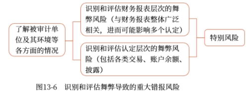 在識(shí)別和評(píng)估財(cái)務(wù)報(bào)表層次以及各類交易、賬戶余額、披露的認(rèn)定層次的重大錯(cuò)報(bào)風(fēng)險(xiǎn)時(shí),注冊(cè)會(huì)計(jì)師應(yīng)當(dāng)識(shí)別和評(píng)估舞弊導(dǎo)致的重大錯(cuò)報(bào)風(fēng)險(xiǎn),如圖13-6所示。