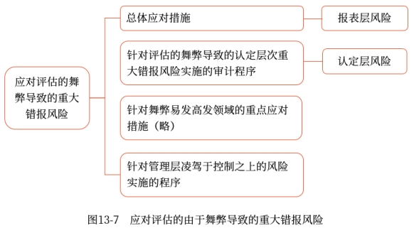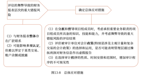 針對(duì)評(píng)估的舞弊導(dǎo)致的財(cái)務(wù)報(bào)表層次重大錯(cuò)報(bào)風(fēng)險(xiǎn),注冊(cè)會(huì)計(jì)師確定的總體應(yīng)對(duì)措施,如圖13-8所示。