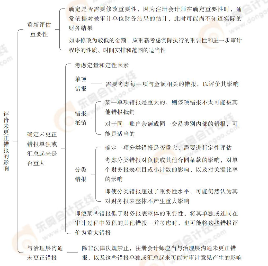 注會(huì)《審計(jì)》第十八章主要涉及完成審計(jì)工作的相關(guān)內(nèi)容,包括評(píng)價(jià)審計(jì)過(guò)程中識(shí)別的錯(cuò)報(bào)、期后事項(xiàng)的審計(jì)、管理層書面聲明書等考點(diǎn),這些內(nèi)容在考試中經(jīng)常出現(xiàn),尤其是客觀題和綜合題中?。注會(huì)審計(jì)第十八章?lián)寣W(xué)記憶樹已更新,快來(lái)學(xué)習(xí)吧!