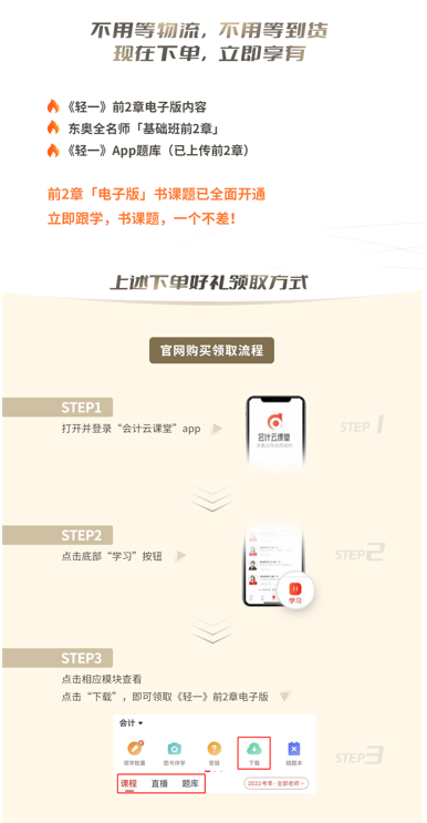 ■ 現(xiàn)在下單注會《輕松過關(guān)?1》系列圖書,會跟隨訂單贈送電子版教材及試題,電子版學(xué)習(xí)資料按照學(xué)習(xí)進(jìn)度上傳,確??忌谝咔槠陂g備考“不掉隊”;物流恢復(fù)正常后,東奧保證疫情和物流管控地區(qū)的學(xué)員將會第一時間收到實(shí)體書《輕一》,還會隨書郵寄贈送一部分相關(guān)視頻課程及試題哦!