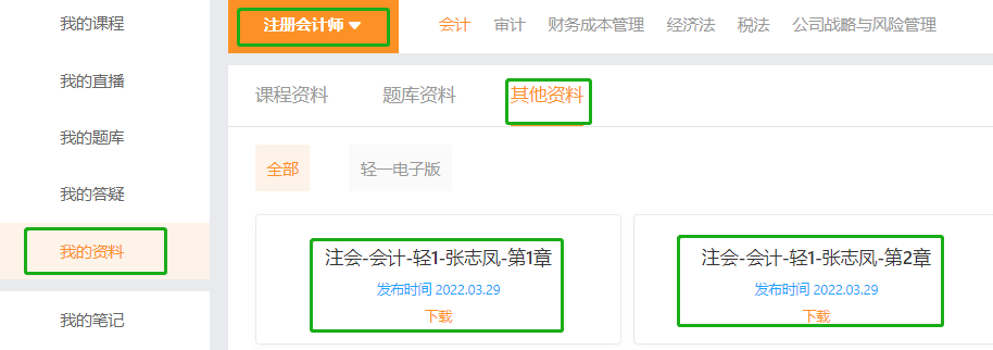 ■ 步驟二:選擇“注冊(cè)會(huì)計(jì)師”考種,點(diǎn)擊側(cè)邊欄“我的資料”欄目,選擇“其他資料”選項(xiàng),即可下載《輕一》電子版內(nèi)容!