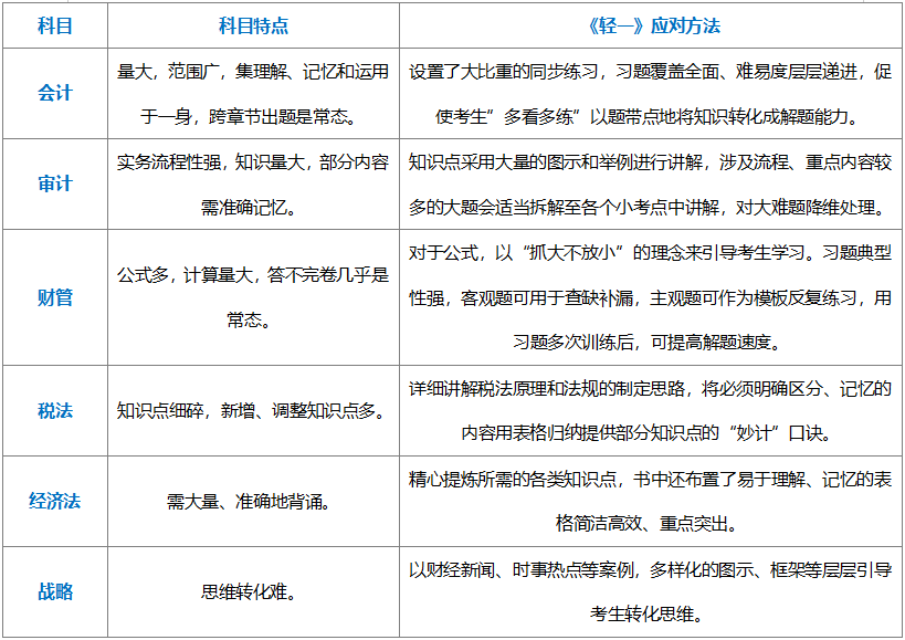 能夠順利通過考試,說明你經(jīng)過了刻苦學(xué)習(xí),掌握了適合自己的學(xué)習(xí)方法。但注會六科特點(diǎn)不同,《輕一》針對其也給出了不同的應(yīng)對方法。在新一輪考試中,希望你能運(yùn)用好《輕一》,結(jié)合各科目的特點(diǎn)順利備考。點(diǎn)擊下方圖片,查看清晰大圖。