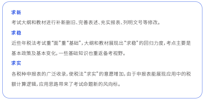 縱觀近年注會考試情況,我們能夠感受到《稅法》科目一直在向“求新”“求穩(wěn)”“求實”的風(fēng)格演變。