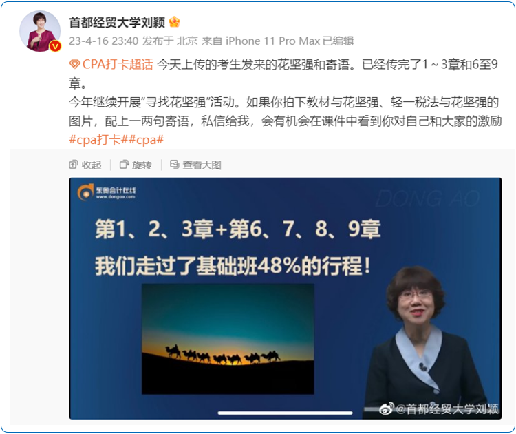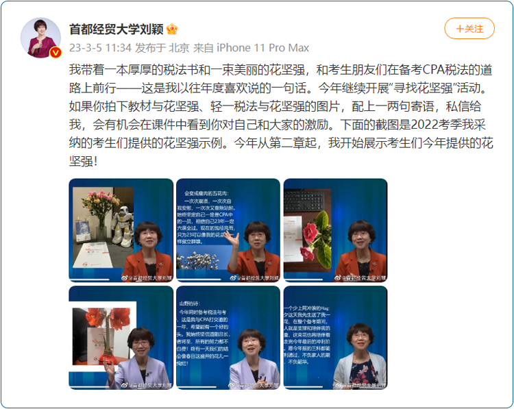 注會考試難度大,備考任務(wù)艱巨,每年都有考生棄考。為鼓勵學(xué)生堅持到底,課堂內(nèi)外,劉穎老師都會暖心鼓勵大家。劉穎老師發(fā)起的,持續(xù)多年的“尋找花堅強(qiáng)”活動,激勵著無數(shù)的注會考生,也見證著他們越過稅法,越過專業(yè)階段,越過注會考試,奔向自己設(shè)定的美好未來。