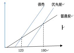【解析】當(dāng)存在三種籌資方式時,最好是畫圖來分析。畫圖時要注意普通股籌資方式的斜率要比另外兩種籌資方式的斜率小,而發(fā)行債券和發(fā)行優(yōu)先股的直線是平行的。本題圖示如下: