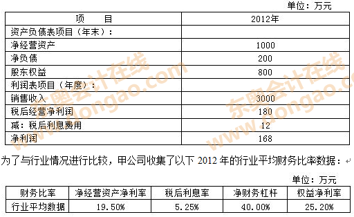 1.甲公司是一家機械加工企業(yè),采用管理用財務(wù)報表分析體系進行權(quán)益凈利率的行業(yè)平均水平差異分析。該公司2012年主要的管理用財務(wù)報表數(shù)據(jù)如下:
