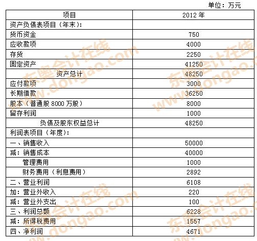 (1)甲公司2012年的主要財務(wù)報表數(shù)據(jù)