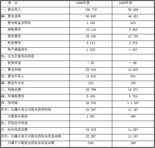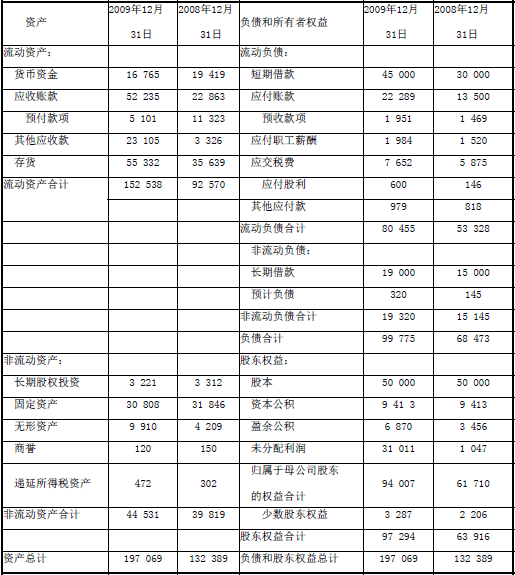 亞新公司2009年度合并資產(chǎn)負(fù)債表和合并利潤(rùn)表以及部分財(cái)務(wù)報(bào)表項(xiàng)目的明細(xì)資料如下(其中:2008年度財(cái)務(wù)數(shù)據(jù)已經(jīng)海天會(huì)計(jì)師事務(wù)所審計(jì),2009年度財(cái)務(wù)數(shù)據(jù)尚未審計(jì)):