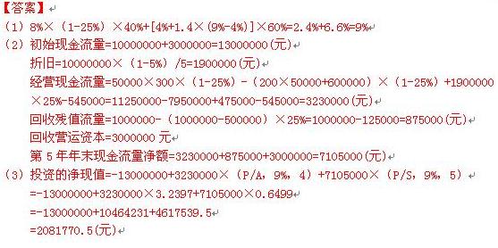 1.甲公司是一家制藥企業(yè)。2008年,甲公司在現(xiàn)有產(chǎn)品P-I的基礎(chǔ)上成功研制出第二代產(chǎn)品P-II。如果第二代產(chǎn)品投產(chǎn),需要新購置成本為10 000 000元的設(shè)備一臺(tái),稅法規(guī)定該設(shè)備使用期為5年,采用直線法計(jì)提折舊,預(yù)計(jì)殘值率為5%。第5年年末,該設(shè)備預(yù)計(jì)市場(chǎng)價(jià)值為l 000 000元(假定第5年年末P-II停產(chǎn))。財(cái)務(wù)部門估計(jì)每年固定成本為600 000元(不含折舊費(fèi)),變動(dòng)成本為200元/盒。另,新設(shè)備投產(chǎn)初期需要投入凈營運(yùn)資金3 000 000元。凈營運(yùn)資金于第5年年末全額收回。