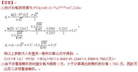 東奧輔導(dǎo)書《輕松過關(guān)一》第114頁綜合題第1題考核的該知識(shí)點(diǎn)。2.2009年8月15日,甲公司股票價(jià)格為每股50元,以甲公司股票為標(biāo)的的代號(hào)為甲49的看漲期權(quán)的收盤價(jià)格為每股5元,甲49表示此項(xiàng)看漲期權(quán)的行權(quán)價(jià)格為每股49元。截至2009年8月15日,看漲期權(quán)還有l(wèi)99天到期。甲公司股票收益的波動(dòng)率預(yù)計(jì)為每年30%,資本市場(chǎng)的無風(fēng)險(xiǎn)利率為年利率7%。