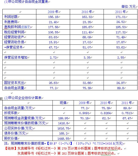 (2)假設(shè)債務(wù)的賬面成本與市場(chǎng)價(jià)值相同,根據(jù)加權(quán)平均資本成本和自由現(xiàn)金流量評(píng)估2008年年末甲公司的企業(yè)實(shí)體價(jià)值和股權(quán)價(jià)值(均指持續(xù)經(jīng)營價(jià)值,下同),結(jié)果填入答題卷第6頁給定的“甲公司企業(yè)估價(jià)計(jì)算表”中。必須填列“預(yù)測(cè)期期末價(jià)值的現(xiàn)值”、“公司實(shí)體價(jià)值”、“債務(wù)價(jià)值”和“股權(quán)價(jià)值” 等項(xiàng)目。