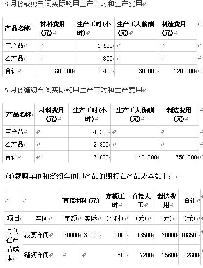 (3)8月份裁剪車間、縫紉車間實際發(fā)生的原材料費用、生產(chǎn)工時數(shù)量以及生產(chǎn)工