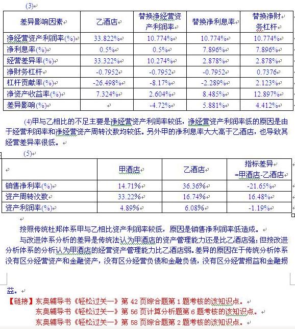 (5)使用傳統(tǒng)杜邦分析體系分別計算甲酒店與乙酒店的資產(chǎn)營運能力,并與改進杜邦體系的分析結果相比較,結果有何差異?并簡要說明理由。