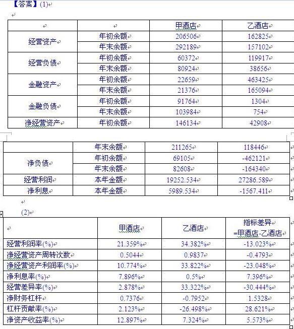 (2)根據(jù)改進杜邦財務分析體系分別計算甲酒店和乙酒店2008年度的經(jīng)營利潤率、