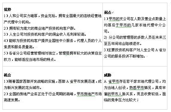 (2)利用SWOT分析的結(jié)果,簡要分析甲市的產(chǎn)業(yè)發(fā)展對人生公司全國業(yè)務(wù)經(jīng)營的影響,以及由此產(chǎn)生的人生公司總部、各省分公司及A省分公司管理層之間的矛盾。