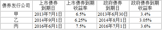 方案2:平價發(fā)行10年期的長期債券。目前新發(fā)行的10年期政府債券的到期收益率為3.6%。H公司的信用級別為AAA級,目前上市交易的AAA級公司債券有3種。這3種公司債券及與其到期日接近的政府債券的到期收益率如下表所示:
