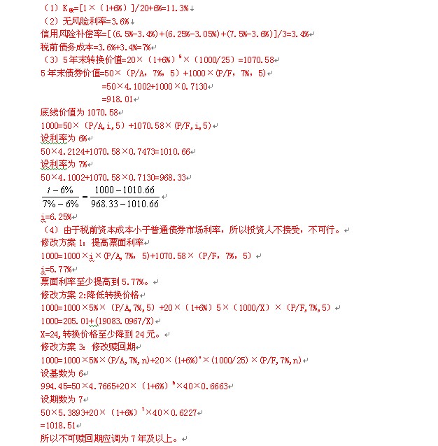 (3)根據方案3,計算第5年末可轉換債券的底線價值,并計算按廣安發(fā)行可轉換債券的稅前資本成本。