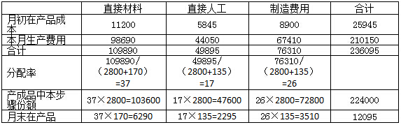 第一步驟制造費用月末在產(chǎn)品約當(dāng)產(chǎn)量=70×50%+100=135(件)
