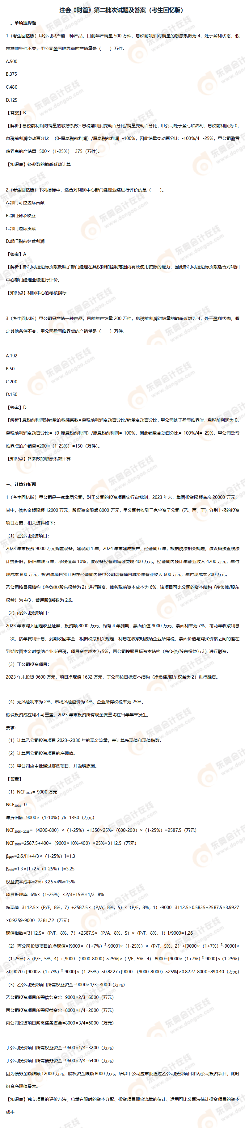 2023年注會財管考題及參考答案第二批次(考生回憶版)