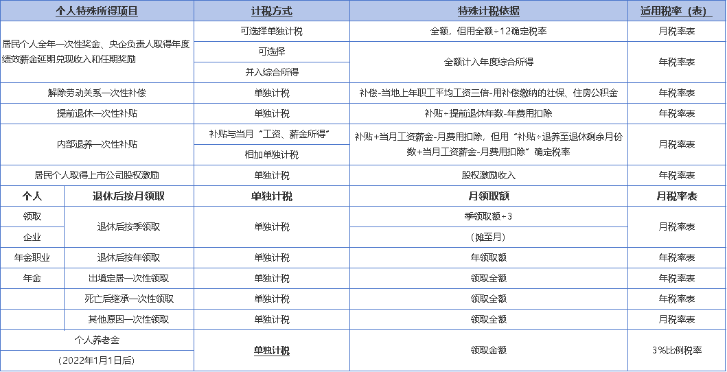 基本減除費(fèi)用6萬(wàn)元/年或者5000元/月在綜合所得或者經(jīng)營(yíng)所得中扣除,不能重復(fù)減除。與工資薪金所得相關(guān)的特殊計(jì)稅規(guī)則一覽表: