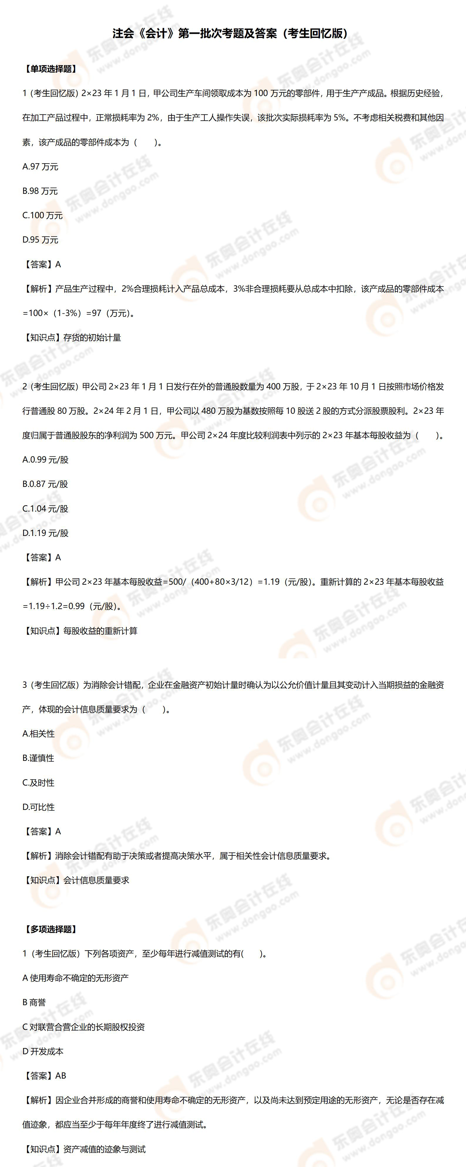 2024年注會(huì)會(huì)計(jì)考題及參考答案第一批次(考生回憶版)