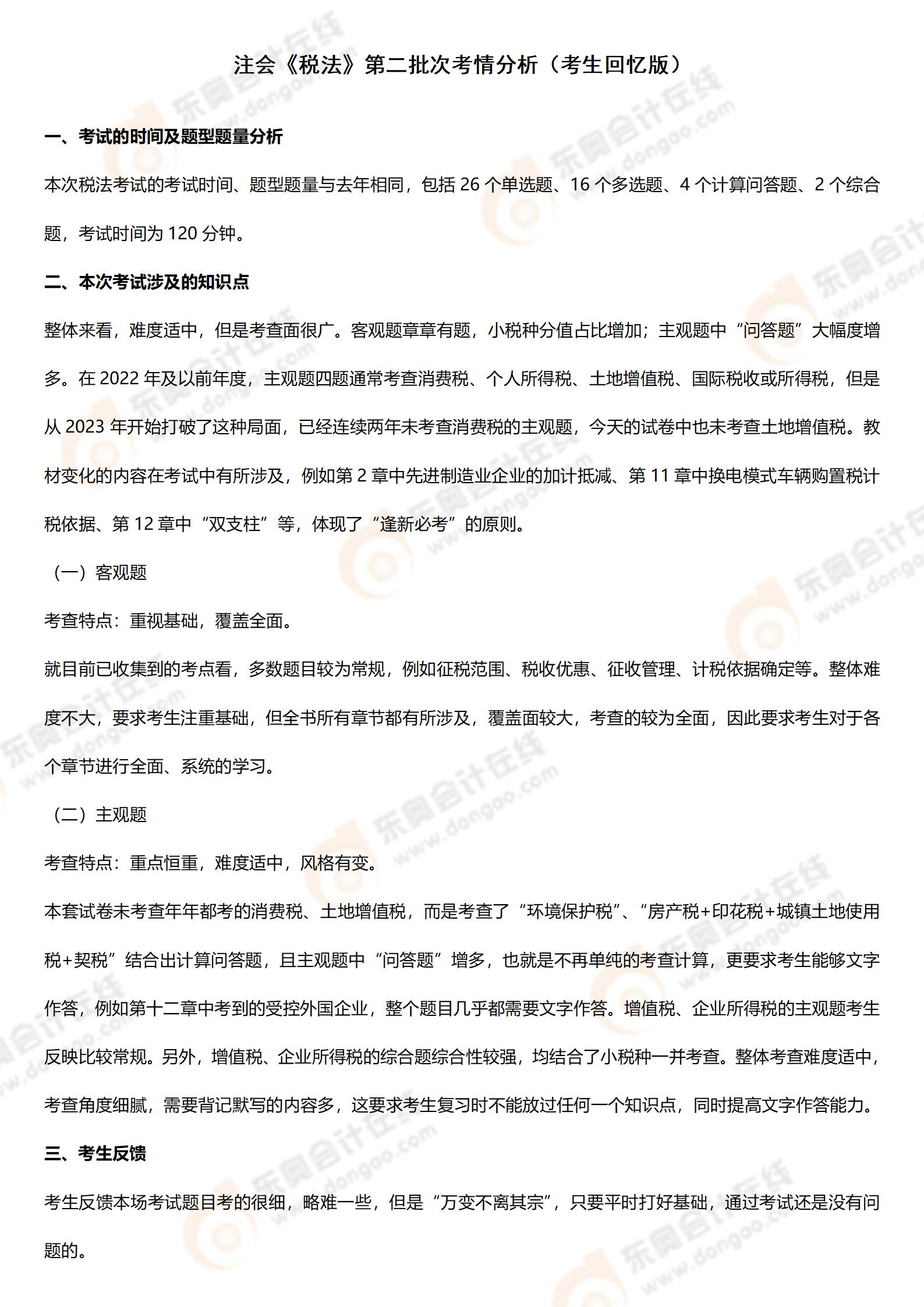 2024年注會稅法第二批次考情分析及考點總結(jié)(考生回憶版)