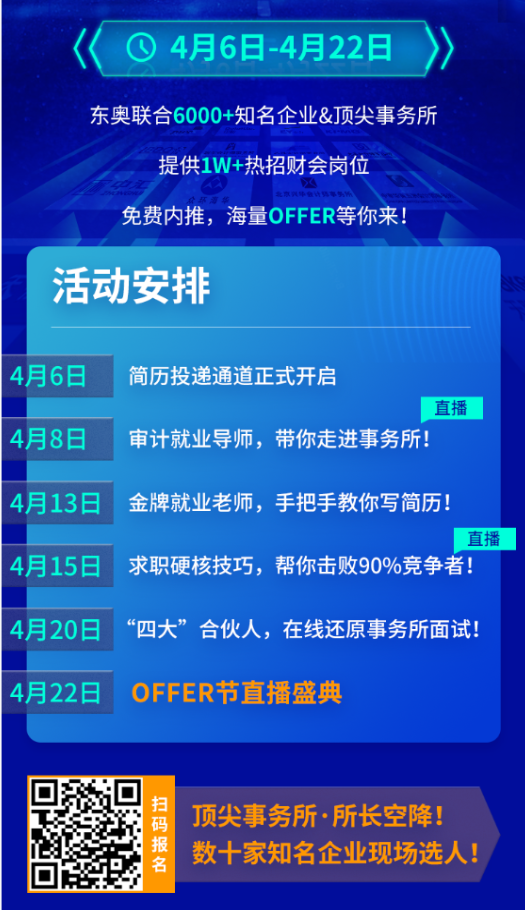 金三銀四跳槽季已經(jīng)來到!你獲得讓你心動的offer了嗎?東奧春招offer節(jié)來啦!東奧聯(lián)合6000+企業(yè)&國內(nèi)事務(wù)所,將在這個4月舉辦一場為期17天的春招offer節(jié)!為大家?guī)?場大型求職直播+1場大型直播offer盛典,提供1w+財會類熱招崗位,幫財會人免費內(nèi)推!只需投遞簡歷,海量高薪offer等你來拿!注冊會計師證書、中級會計師證書替你升職加薪的機會來了!