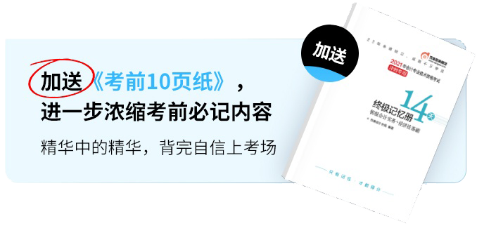 在歷年CPA考試當(dāng)中,越有50%的分?jǐn)?shù)來(lái)源于記憶,多選題和主觀題均需在“應(yīng)用”的基礎(chǔ)上才能得分!名師精心編撰三大版塊,通過(guò)學(xué)、背、練一體化同步進(jìn)行,在21天內(nèi)幫你盡可能的掌握更多知識(shí)點(diǎn)。是不是以為這就結(jié)束了?當(dāng)然沒(méi)有!備受考生好評(píng)的臨考神器—最后十頁(yè)紙,直接隨書(shū)免費(fèi)附贈(zèng)!