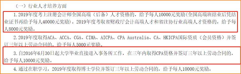 在江蘇省注協(xié)發(fā)布的關(guān)于組織申報(bào)2019年度江蘇省注冊(cè)會(huì)計(jì)師行業(yè)人才培養(yǎng)專項(xiàng)資金獎(jiǎng)補(bǔ)項(xiàng)目的通知中,明確了申報(bào)范圍及標(biāo)準(zhǔn)。符合條件的行業(yè)人才最高可獲得40000元獎(jiǎng)勵(lì)。