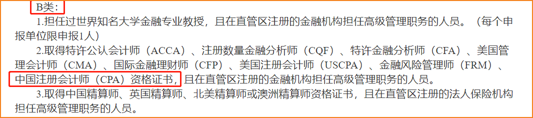 在四川天府新區(qū)成都直管區(qū)“天府英才計(jì)劃”實(shí)施辦法(修訂版)中,明確表示取得中國(guó)注冊(cè)會(huì)計(jì)師(CPA)資格證書,且在直管區(qū)注冊(cè)的金融機(jī)構(gòu)擔(dān)任高級(jí)管理職務(wù)的人員屬于高級(jí)人才B類。