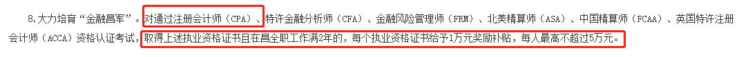 在南昌市人民政府辦公室印發(fā)的關(guān)于促進(jìn)全市金融業(yè)高質(zhì)量發(fā)展的若干政策措施的通知中表明:取得 注冊會計師執(zhí)業(yè)資格證書在昌全職工作滿2年的,給予1萬元獎勵補(bǔ)貼,每人最高不超過5萬元。政策原文戳我獲取>>>