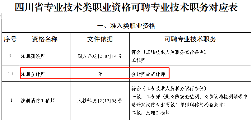 在四川省人力資源和社會保障廳關(guān)于部分專業(yè)技術(shù)類職業(yè)資格可聘相應(yīng)專業(yè)技術(shù)職務(wù)的通知中表明:通過國家職業(yè)資格考試,取得房地產(chǎn)估價師、造價工程師、注冊城鄉(xiāng)規(guī)劃師、執(zhí)業(yè)藥師、注冊安全工程師、注冊核安全工程師、注冊驗船師、注冊計量師、注冊測繪師、注冊會計師、注冊消防工程師、護士執(zhí)業(yè)資格、醫(yī)師執(zhí)業(yè)資格等13項準入類職業(yè)資格的人員,用人單位可根據(jù)相關(guān)任職條件和崗位空缺情況聘任相應(yīng)的專業(yè)技術(shù)職務(wù)。其中,擁有注冊會計師證書的人員可聘專業(yè)技術(shù)職務(wù)為會計師或?qū)徲嫀?/span>。