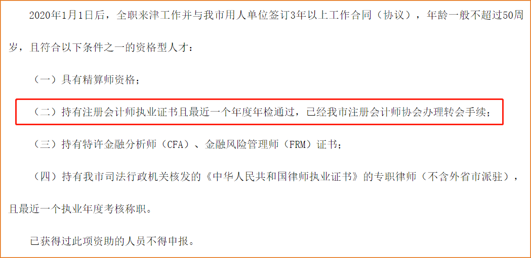 從《天津市人社局關(guān)于開展2021年資格型人才引進(jìn)專項(xiàng)資助申報(bào)工作的通知》中我們能夠得知:2020年1月1日后,全職來津工作并與我市用人單位簽訂3年以上工作合同(協(xié)議),年齡一般不超過50周歲,持有注冊會(huì)計(jì)師執(zhí)業(yè)證書且最近一個(gè)年度年檢通過,已經(jīng)我市注冊會(huì)計(jì)師協(xié)會(huì)辦理轉(zhuǎn)會(huì)手續(xù)的注冊會(huì)計(jì)師,可獲得3萬元獎(jiǎng)勵(lì)資助。
