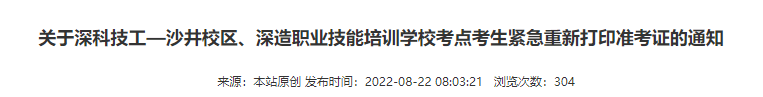 受深圳突發(fā)新冠疫情的影響,深圳市深科技工學(xué)?!尘^(qū)、深圳市龍崗區(qū)深造職業(yè)技能培訓(xùn)學(xué)校考點將緊急調(diào)整到其他區(qū)域,請以上兩個考點已打印準考證的考生務(wù)必于8月23日晚上8點前重新打印準考證,如因未及時重新打印準考證,最后將無法正常參加考試。深圳考辦將通過短信、委托電信運營商來電的形式進行通知,請各位考生近期留意接聽來電并及時查看短信。