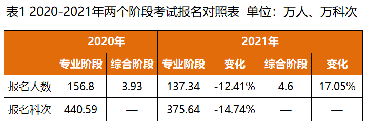 如表1所示,2021年有141.94萬(wàn)人報(bào)名參考CPA考試,其中專(zhuān)業(yè)階段報(bào)名人數(shù)為137.34萬(wàn)人,同比下降12.41%。綜合階段報(bào)名人數(shù)為4.6萬(wàn)人,同比增長(zhǎng)17.05%。