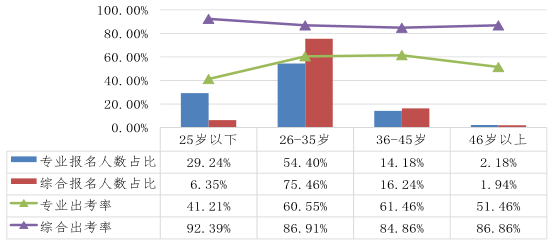 如圖2所示,35歲以下(含35歲)的考生占專(zhuān)業(yè)階段報(bào)名總?cè)藬?shù)的83.64%,占綜合階段報(bào)名總?cè)藬?shù)的81.81%,其中26歲至35歲(含35歲)的報(bào)名考生人數(shù)均過(guò)半。從出考率來(lái)看,專(zhuān)業(yè)階段25歲以下(含25歲)的考生出考率最低,但是綜合階段的出考率高達(dá)92.39%。