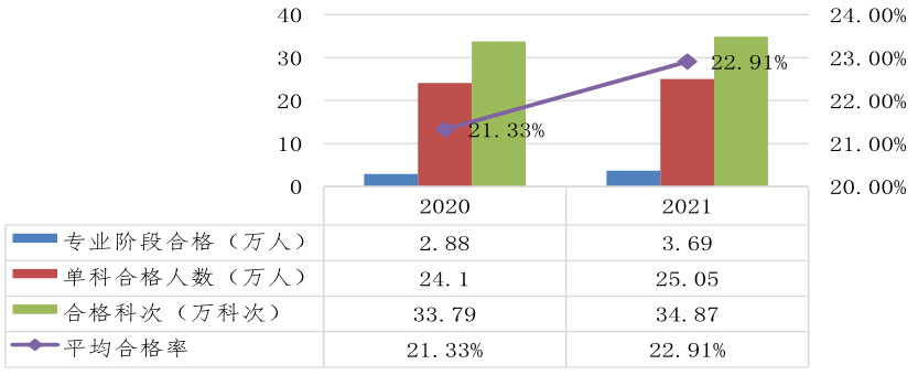 如圖4所示,2021年CPA專(zhuān)業(yè)階段考試6個(gè)科目的平均合格率為22.91%,同比增長(zhǎng)1.58%。專(zhuān)業(yè)階段單科合格人數(shù)達(dá)25.05萬(wàn)人,專(zhuān)業(yè)階段合格人數(shù)為3.69萬(wàn)人。