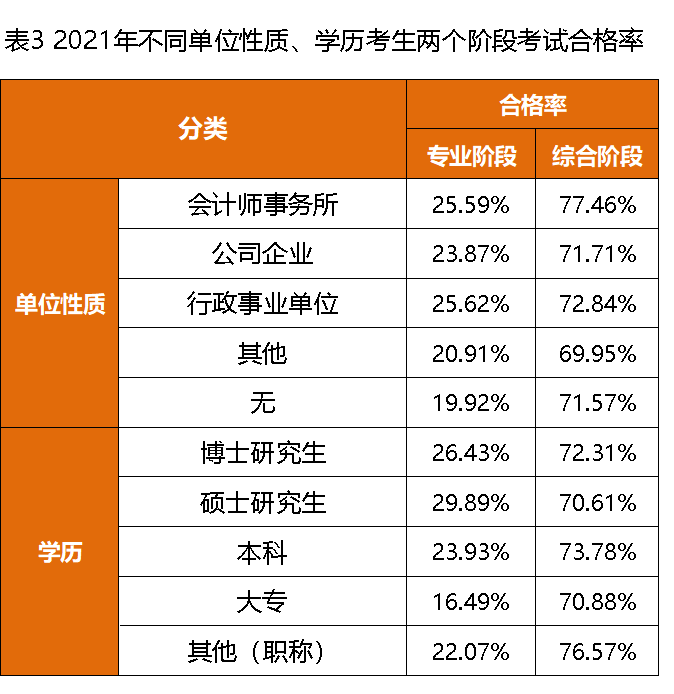 如表3所示,從單位性質(zhì)角度來(lái)看,會(huì)計(jì)師事務(wù)所和行政事業(yè)單位的專(zhuān)業(yè)階段合格率最高,均在25%以上。其次是公司企業(yè)和其他職位,而無(wú)單位的考生合格率最低,不足20%。在綜合階段,會(huì)計(jì)師事務(wù)所考生的合格率最高,其次是行政事業(yè)單位。從學(xué)歷上來(lái)看,研究生學(xué)歷的考生專(zhuān)業(yè)合格率最高,但是本科學(xué)歷考生綜合階段合格率較高,整體來(lái)看,學(xué)歷對(duì)于合格率還是有一定影響的。