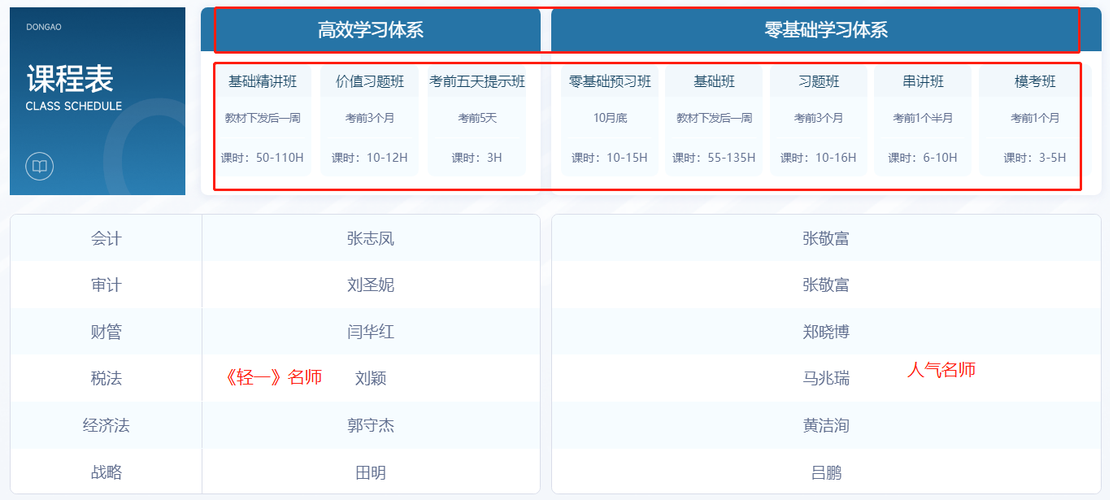 東奧不僅有張志鳳、郭守杰、閆華紅、劉穎、劉圣妮、田明、范永亮這樣專(zhuān)業(yè)領(lǐng)域的踔絕之能,還有張敬富、黃潔洵、蘇蘇、鄭曉博、呂鵬等深受學(xué)員們喜愛(ài)的人氣名師,更有一批初露頭角的新生代名師們。老師們授課風(fēng)格各異,對(duì)知識(shí)都有自己獨(dú)到見(jiàn)解,學(xué)員可以根據(jù)自己的喜好、適應(yīng)程度選擇自己喜歡的名師。網(wǎng)課的專(zhuān)業(yè)性主要體現(xiàn)在對(duì)考生基礎(chǔ)程度、備考進(jìn)度的把握上。以2023年注冊(cè)會(huì)計(jì)師C雙名師輕松過(guò)關(guān)?班為例,根據(jù)不同時(shí)間、學(xué)員不同的基礎(chǔ)情況,進(jìn)行了不同的課程設(shè)置。