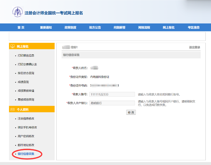 1.請登錄“注冊會計(jì)師全國統(tǒng)一考試網(wǎng)上報(bào)名系統(tǒng)https://cpaexam.cicpa.org.cn/”,在“銀行信息采集”欄目中進(jìn)行填報(bào)。