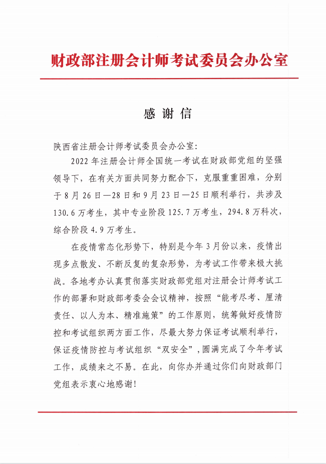 財(cái)政部注冊(cè)會(huì)計(jì)師委員會(huì)對(duì)陜西省注會(huì)考試順利進(jìn)行的感謝信