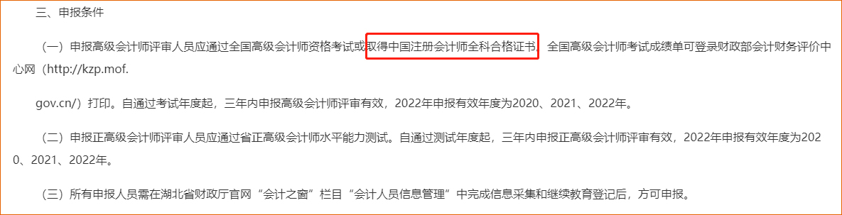 湖北注冊會(huì)計(jì)師可直接申請參加高級(jí)會(huì)計(jì)師評(píng)審!湖北省財(cái)政廳發(fā)布的《關(guān)于報(bào)送2022年度湖北省高級(jí)、正高級(jí)會(huì)計(jì)師專業(yè)技術(shù)職務(wù)任職資格評(píng)審材料的通知》中標(biāo)明:高級(jí)會(huì)計(jì)師申報(bào)人員應(yīng)通過全國高級(jí)會(huì)計(jì)師資格考試或取得中國注冊會(huì)計(jì)師全科合格證書。這也就是說明,符合條件的湖北注冊會(huì)計(jì)師可免試高會(huì),直接申請參加高級(jí)會(huì)計(jì)師評(píng)審。