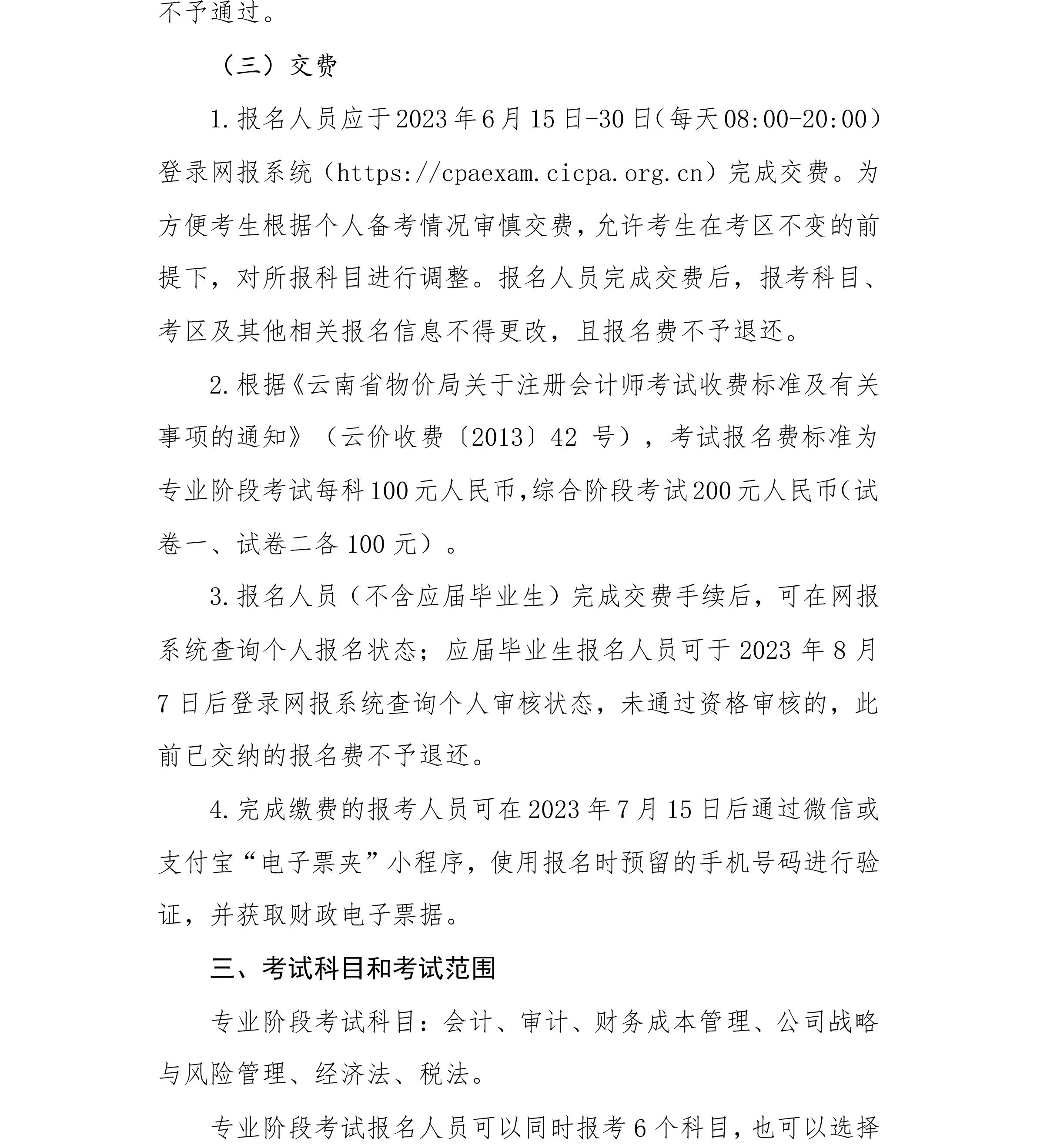 近日,云南省注冊會計師協(xié)會發(fā)布了《云南省2023年注冊會計師全國統(tǒng)一考試報名公告》,云南注會專業(yè)階段報名費用為100元/科,綜合階段考試報名費用為200元。以下是簡章原文,一起來看看吧!