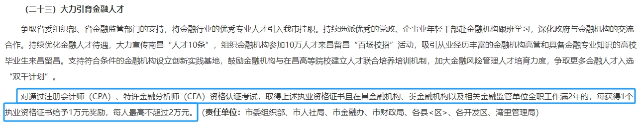 在南昌市人民政府印發(fā)的《關(guān)于打造區(qū)域金融中心 加快金融業(yè)高質(zhì)量發(fā)展的實(shí)施意見(jiàn)》的通知中我們能夠知道,對(duì)通過(guò)注冊(cè)會(huì)計(jì)師(CPA)資格認(rèn)證考試,取得執(zhí)業(yè)資格證書(shū)且在昌金融機(jī)構(gòu)、類(lèi)金融機(jī)構(gòu)以及相關(guān)金融監(jiān)管單位全職工作滿(mǎn)2年的,每獲得1個(gè)執(zhí)業(yè)資格證書(shū)給予1萬(wàn)元獎(jiǎng)勵(lì),每人最高不超過(guò)2萬(wàn)元。