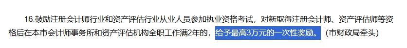 為了促進(jìn)行業(yè)發(fā)展,深圳市財政局曾發(fā)布關(guān)于《加快我市注冊會計師和資產(chǎn)評估行業(yè)高質(zhì)量發(fā)展行動計劃(2023-2025年)》的通知,對新取得注冊會計師、資產(chǎn)評估師等資格后在本市會計師事務(wù)所和資產(chǎn)評估機(jī)構(gòu)全職工作滿2年的,給予最高3萬元的一次性獎勵。