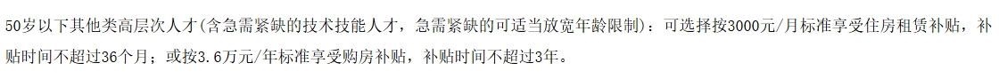 根據(jù)中共海南省委辦公廳、海南省人民政府辦公廳印發(fā)的《海南省關(guān)于引進(jìn)人才住房保障的指導(dǎo)意見》的通知規(guī)定,50歲以下其他類高層次人才(含急需緊缺的技術(shù)技能人才,急需緊缺的可適當(dāng)放寬年齡限制):可選擇按3000元/月標(biāo)準(zhǔn)享受住房租賃補(bǔ)貼,補(bǔ)貼時(shí)間不超過36個(gè)月;或按3.6萬元/年標(biāo)準(zhǔn)享受購房補(bǔ)貼,補(bǔ)貼時(shí)間不超過3年。