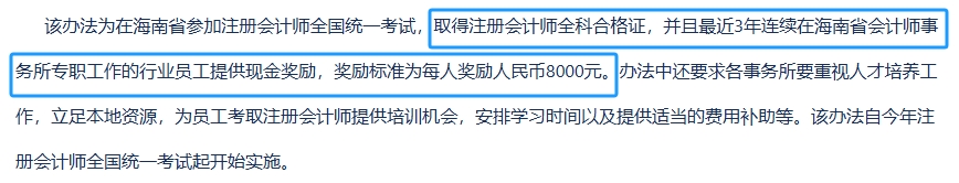 《海南省注冊會(huì)計(jì)師行業(yè)關(guān)于鼓勵(lì)從業(yè)人員考取注冊會(huì)計(jì)師資格的獎(jiǎng)勵(lì)暫行辦法》規(guī)定,在海南省參加注冊會(huì)計(jì)師全國統(tǒng)一考試,取得注冊會(huì)計(jì)師全科合格證,并且最近3年連續(xù)在海南省會(huì)計(jì)師事務(wù)所專職工作的行業(yè)員工提供現(xiàn)金獎(jiǎng)勵(lì),獎(jiǎng)勵(lì)標(biāo)準(zhǔn)為每人獎(jiǎng)勵(lì)人民幣8000元。