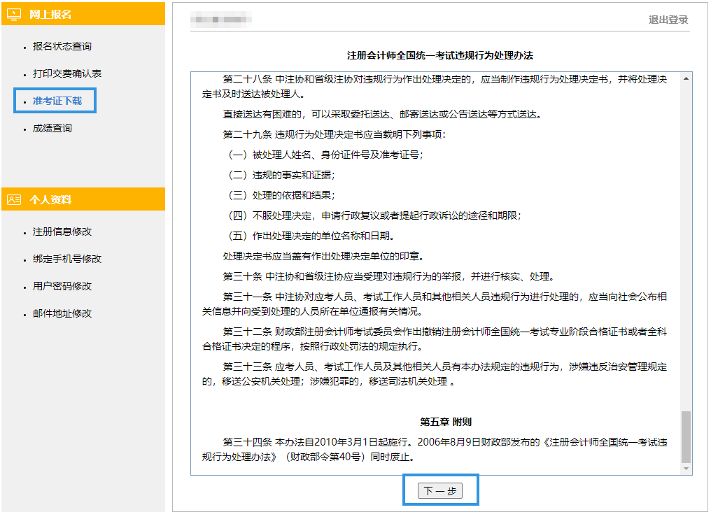 第三步:閱讀《注冊會計師全國統(tǒng)一考試違規(guī)行為處理辦法》后點擊“下一步”;