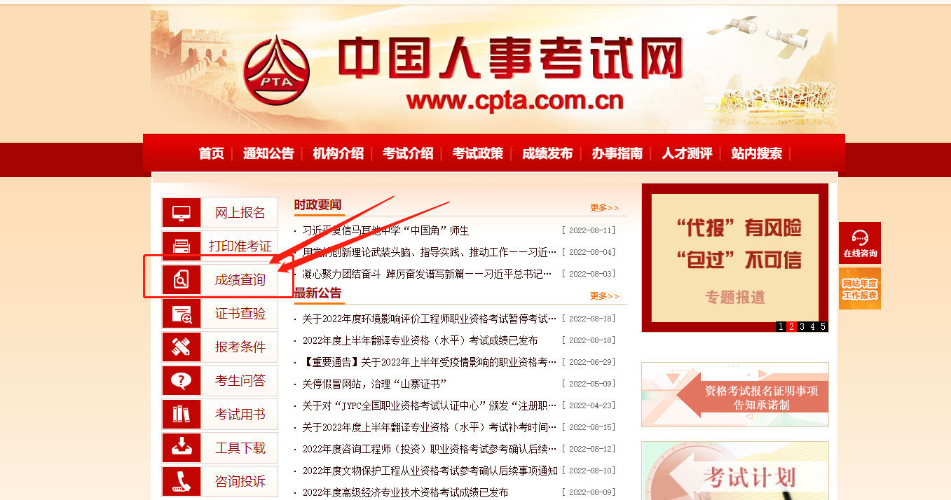 2022年中級經(jīng)濟(jì)師考試成績在中國人事考試網(wǎng)查詢,網(wǎng)址為http://www.cpta.com.cn/,中級經(jīng)濟(jì)師成績查詢時間預(yù)計在23年1月,考生可以在考試結(jié)束后關(guān)注中國人事考試網(wǎng)及所在地區(qū)的官方通知,成績查詢通道在進(jìn)入中國考試網(wǎng)之后可看到左側(cè)“成績查詢”欄目,如圖所示: